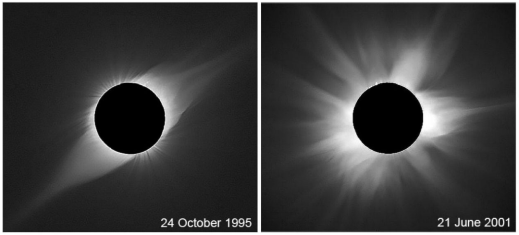 During periods of high sunspot activity, light beams are more evenly distributed with the sun’s corona; If the solar minimum is at its minimum, the corona and light beams are concentrated at the sun’s equatorial latitudes.
